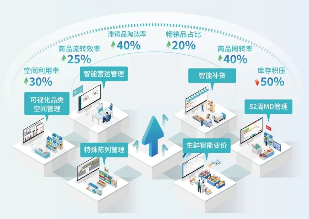 智能补货基于AI计算模型,对标品、生鲜品精准预测,把缺货率和损耗率一起降下来。